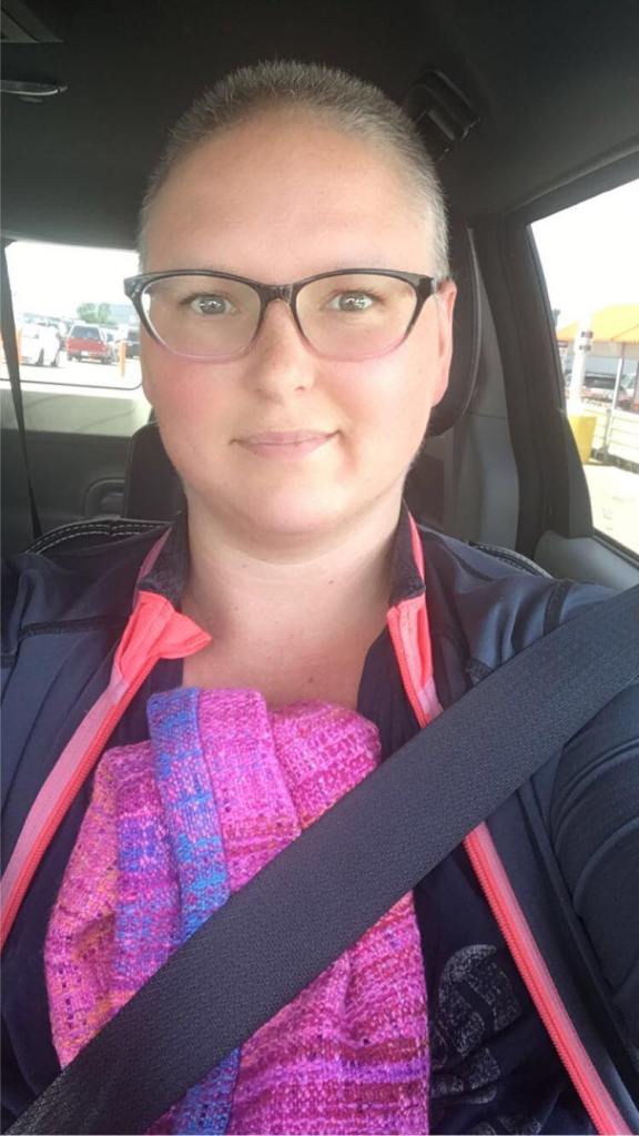During the morning and early afternoon the day after surgery, I was missing my kids. Two nights away was HARD. I also knew I wouldn’t be able to have them stay home Wednesday night, so we decided to head to my parents place for supper. I figured it would be easier for us to come and go, than to try and pack the kids up to go back to grandma and grandpas house. This is my first drive since coming home, and my physiotherapist recommended using a rolled towel between my chest and the seat belt. I luckily had a beautiful cowl made when I was diagnosed that was cushion-y enough, plus super pretty. So I have been using that.