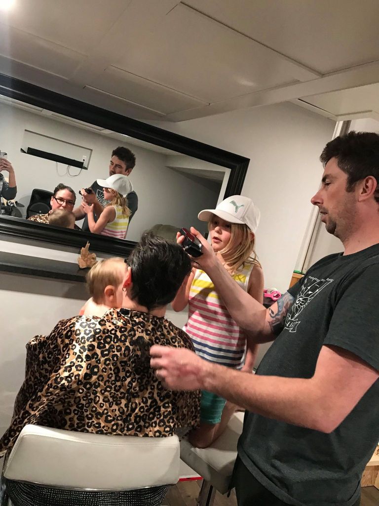 When I knew that my plan included chemo I knew that I would be losing my hair (too bad the under arm and leg hair wouldn’t stay gone!), so we as a family chopped it all off into a cute short cut with the help of a good friend. This way it wasn’t a surprise to the kids that it was gone – they got to be there and help!